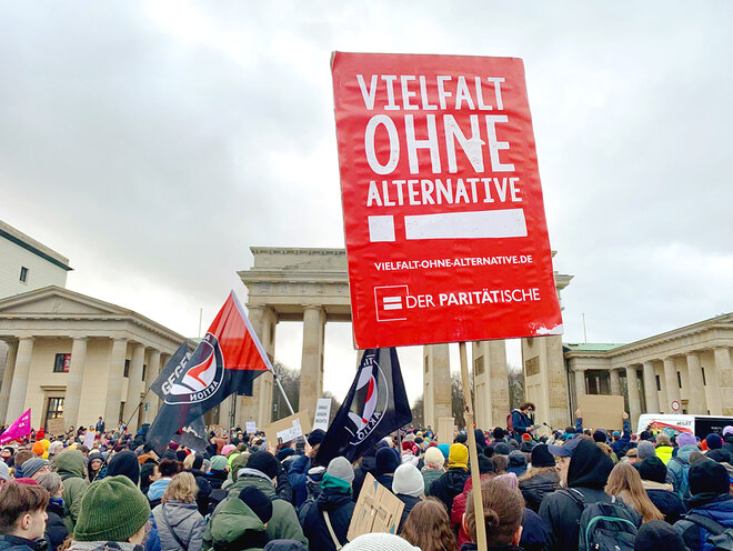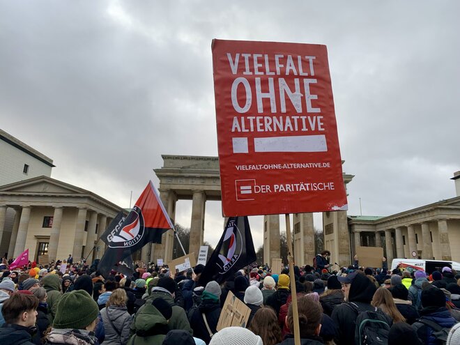 Die jüngsten Rechercheergebnisse des Netzwerks CORRECTIV über rechtsextreme „Geheimtreffen“ haben in den vergangenen Tagen eine enorme Protest-Dynamik entwickelt. Bei einer spontanen Demonstration am 14. Januar war auch der Paritätische Gesamtverband mit dabei.